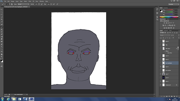 Here i drew over my outline with the colour black using the brush tool, i then selected the colour purple and red for the eyes and eye lids.